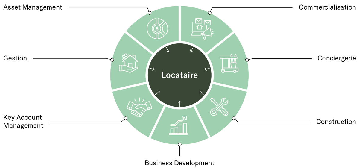 La location de bureaux ou de surfaces de vente est le début d'une relation client à long terme. Mais les bases de cette relation sont posées bien avant, lors des premiers entretiens avec le client, de l'évaluation du bien immobilier idéal et du déroulement professionnel du processus de location. S'ensuit un accompagnement complet lors de l’aménagement et de l'emménagement dans le bien immobilier. La tâche de nos gérants et concierges sur place consiste ensuite à identifier à un stade précoce les nouveaux besoins des clients, à les soutenir de manière proactive et à prendre les mesures nécessaires. Nous proposons tous ces services en interne, ce qui est unique dans le secteur.