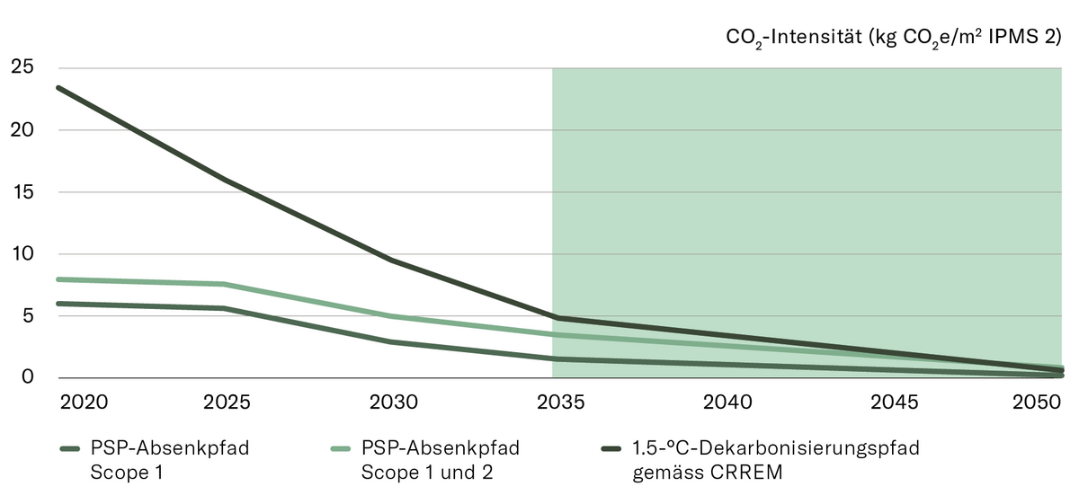 2023 haben wir haben unseren CO2-Absenkpfad mit dem 1.5 °C-Dekarbonisierungspfad von CRREM verglichen. Basierend auf dieser Analyse sind wir aus heutiger Sicht mit unserem Portfolio auf gutem Weg, unseren Beitrag zum 1.5 °C-Ziel zu leisten («1.5 °C-Ziel aligned»). Dank diesen Zielen und den entsprechenden Massnahmen sehen wir uns auch gut gewappnet gegenüber möglichen Transitionsrisiken wie höheren CO2-Preisen oder strengeren Bauvorschriften.