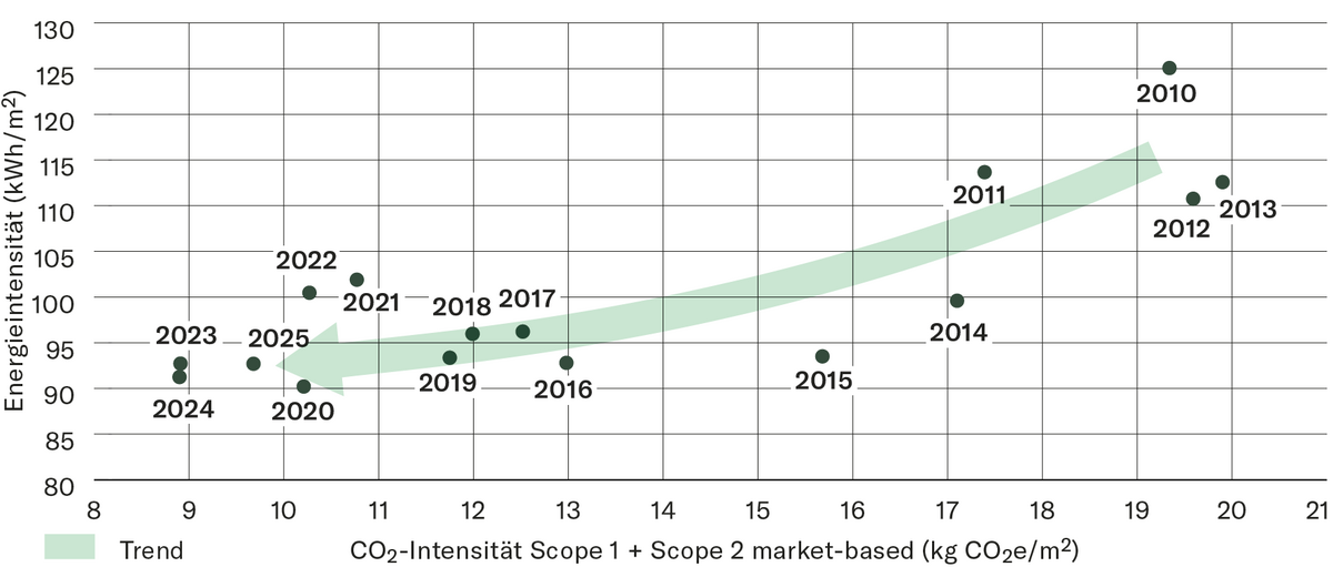 Der CO2-Reduktionspfad, welcher erstmals 2020 kommuniziert wurde, orientiert sich an den internationalen und nationalen Zielen und Rahmenbedingungen, aber auch an den tatsächlichen Gegebenheiten in den einzelnen Gebäuden. Die Details zum Szenario, das dem Absenkpfad zugrunde liegt, sind im Nachhaltigkeitsbericht 2020 zu finden. Das Basisjahr für den CO2-Absenkpfad und die Zwischenziele ist das Jahr 2019.
